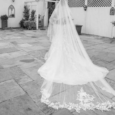 dramatic end to your train. I can also cut your chosen lace into motifs which can be scattered all over the Veil or meticulously placed around the edge for a truly unique look. Traditional or modern, lace can work with any gown so long as we work together to find matching lace or lace which mirrors elements of your dress.